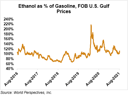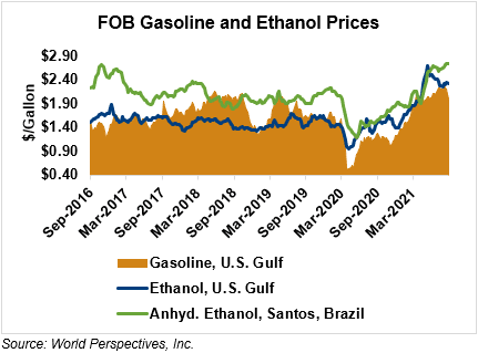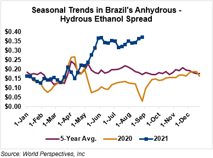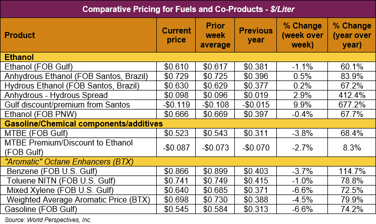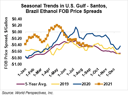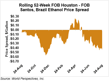 The FOB Gulf-Santos, Brazil ethanol spread has widened from last week’s close through Tuesday’s trading and is currently at -11.87 cents/liter (-44.93 cents/gallon).