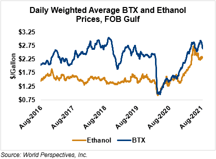 BTX component prices were mixed last week but are lower through Tuesday’s market close: Benzene is down 3.5 percent while Toluene is down 0.9 percent, and Xylene is down 6.3 percent. The estimated weighted average aromatic price is currently 69.93 cents/liter (264.71 cents/gallon), down from last Friday’s close. The BTX-Houston ethanol spread narrowed last week, and the weighted average BTX price is 8.93 cents/liter (33.81 cents/gallon) higher than the FOB Houston ethanol price.