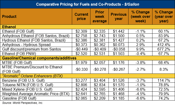 FOB Houston ethanol prices finished last week 2.2 percent higher but are down 1.1 percent through Tuesday’s trading from Friday’s close. FOB Houston ethanol prices are quoted at 61 cents/liter (230.91 cents/gallon). FOB Santos, Brazil anhydrous ethanol prices were higher last week; they are up in early week trading, rising 0.5 percent to 72.87 cents/liter (275.84 cents/gallon) through Tuesday’s trading.