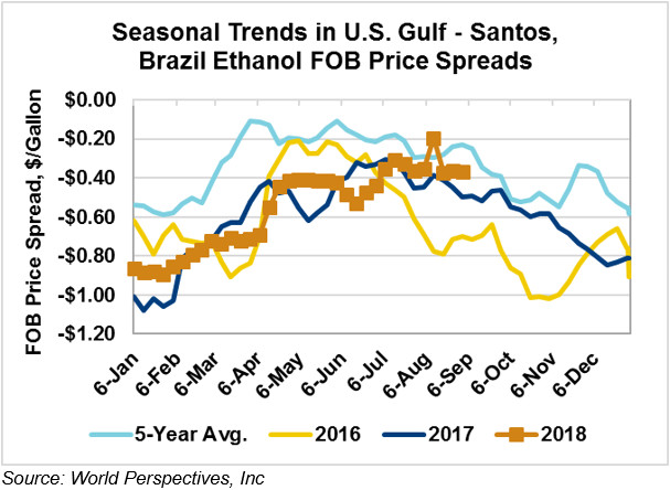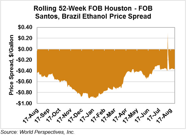 The FOB Gulf-Santos, Brazil spread has widened from last week’s close through Tuesday’s trading and is currently at -9.912 cents/liter (-37.52 cents/gallon).