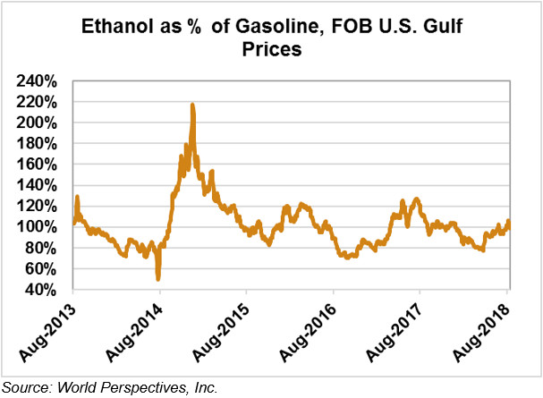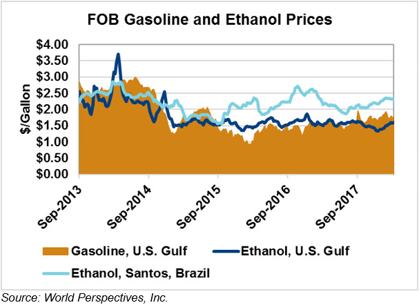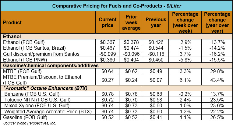 FOB Houston ethanol prices finished last week down over 2 percent and are down nearly 3 percent through Tuesday’s trading. FOB Houston prices are quoted at 36.740 cents/liter (139.075 cents/gallon). FOB Santos, Brazil ethanol prices ended last week down. This week the downward trend continues, with FOB Santos, Brazil prices at 46.651 cents/liter (176.595 cents/gallon) through Tuesday’s trading.