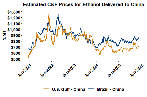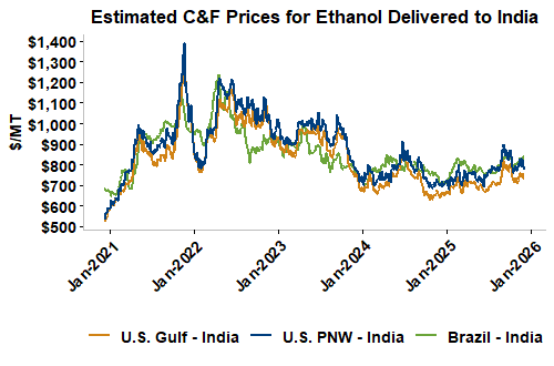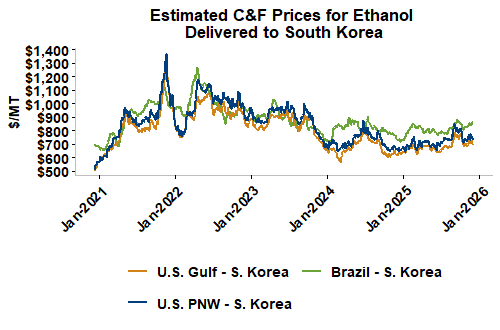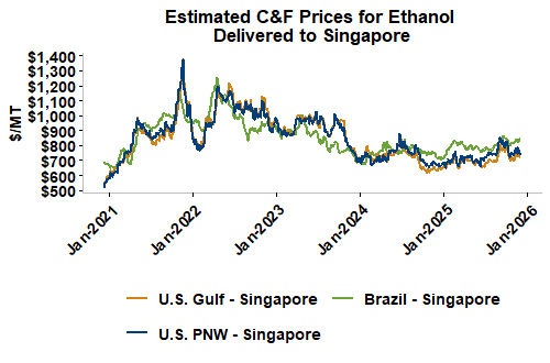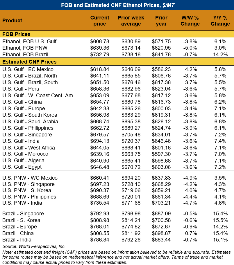 On a cost-and-freight (C&F) basis, offers are mostly lower this week as both freight rates and FOB ethanol offers have moved below last week’s values. Prices for ethanol C&F to Central America from the U.S. Gulf are down 3.8 percent this week and are up 5.7 percent from this same week in 2024. Values for PNW ethanol to Southeast Asia average $692.10/MT this week, down 4.2 percent from the prior week but up 4.4 percent year-over-year. That compares to U.S. Gulf to Southeast Asia C&F prices that average $666.42/MT and are down 3.8 percent from last week but are up 6.4 percent year-over-year. C&F prices for Brazilian ethanol to Southeast Asia are down 0.7 percent from last week.