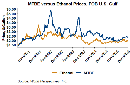 MTBE prices fell 2.3 percent last week but reversed course in early week trading to fall 5.6 percent from Friday’s close through Tuesday’s trading. MTBE’s premium to FOB Houston ethanol has decreased from last week’s report and stands at 11.45 cents/liter (43.36 cents/gallon).