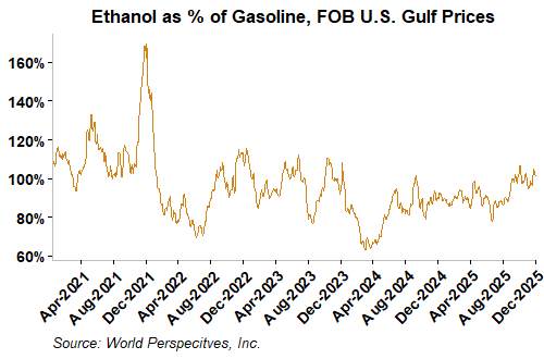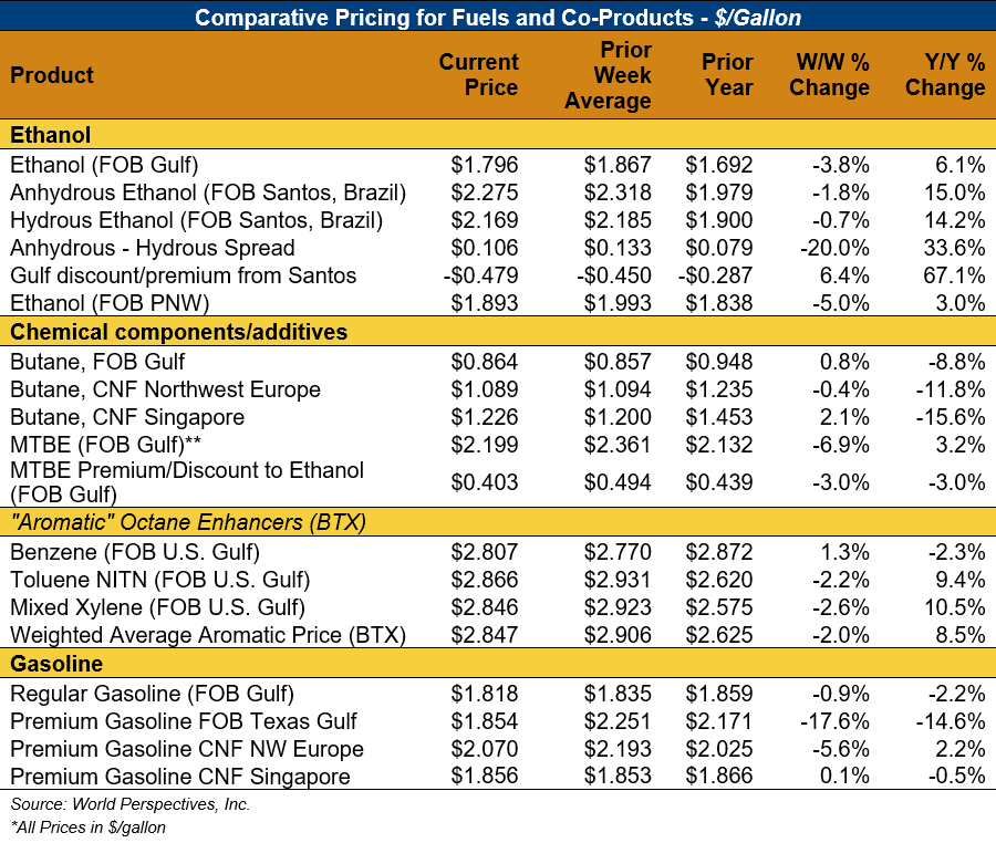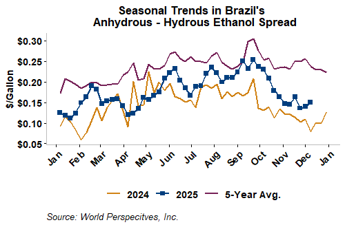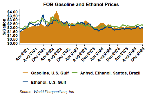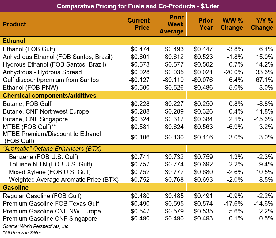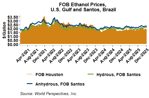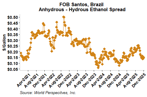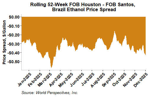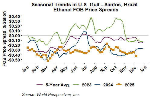 The FOB Gulf-Santos, Brazil ethanol spread has narrowed from last week’s close through Tuesday’s trading and is currently at -12.66 cents/liter (-47.92 cents/gallon).