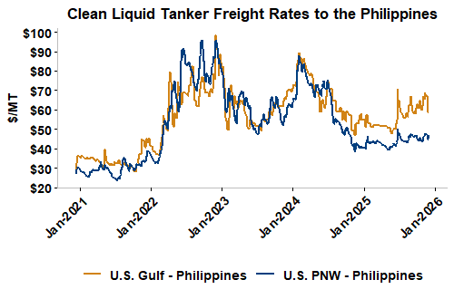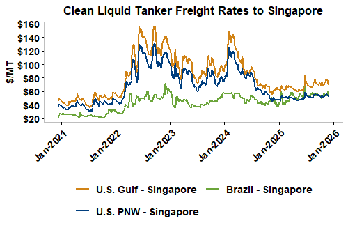 Liquid tanker rates are 1 percent lower on average this week with offers for the U.S. PNW to South Korea seeing the largest gains (up 11 percent). Freight from the U.S. Gulf to the East Coast of Mexico saw the largest declines and is down 21 percent from last week. On average, tanker freight from the U.S. Gulf is down 3 percent this week while freight from the PNW has posted a 5 percent increase. Liquid tanker freight rates from Brazil are down 0.1 percent, on average, this week. Freight rates across all origins are 17 percent higher than this same week in 2024.