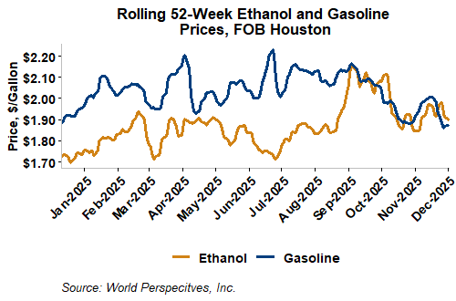 FOB Houston ethanol prices finished last week 4.9 percent lower and are down 1.1 percent through Tuesday’s trading from Friday’s close. FOB Houston ethanol prices are quoted at 47.45 cents/liter (179.61 cents/gallon). FOB Santos, Brazil anhydrous ethanol prices were higher last week; they are down in early week trading, falling 1.8 percent to 60.1 cents/liter (227.52 cents/gallon) through Tuesday’s close.