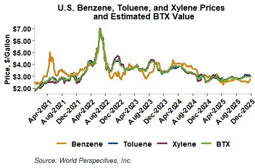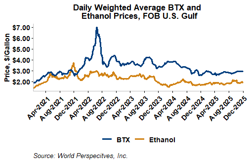 BTX component prices were mixed last week and remained so through Tuesday’s market close: Benzene was up 1.1 percent while Toluene was down 1.8 percent, and Xylene was down 2.1 percent. The estimated weighted average aromatic price is currently 75.53 cents/liter (285.9 cents/gallon), down from last Friday’s close. The BTX-Houston ethanol spread narrowed last week, and the weighted average BTX price is 28.08 cents/liter (106.29 cents/gallon) higher than the FOB Houston ethanol price.