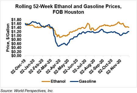 Market Outlook: U.S. ethanol prices ended last week 1.5 percent higher but are reversing that trend in early week trading, down 2.5 percent through Tuesday’s close. Midwest wholesale rack ethanol prices were lower to end last week and are down 0.9 percent through Tuesday’s market close to their last quote of 38.78 cents/liter (146.81 cents/gallon).
