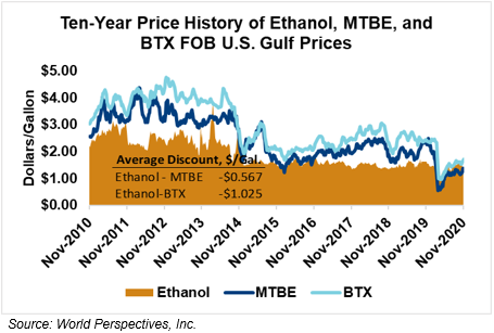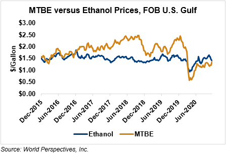 MTBE prices rose 6.1 percent last week and are extending those gains in early week trading, up 5.6 percent from Friday’s close through Tuesday’s trading. MTBE’s premium to FOB Houston ethanol has increased from last week’s report and stands at -0.97 cents/liter (-3.66 cents/gallon).