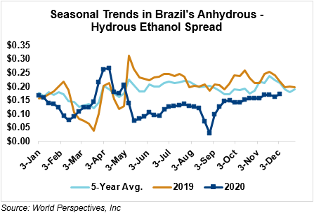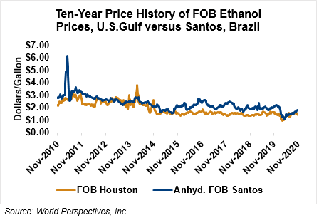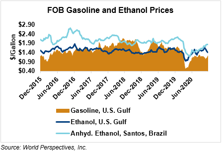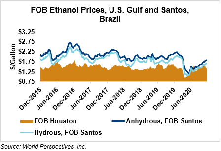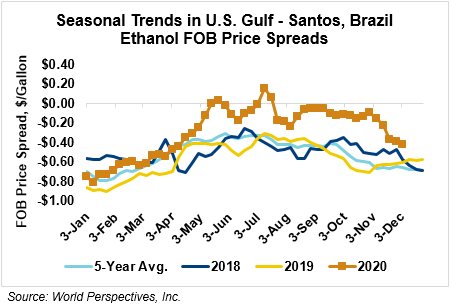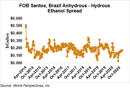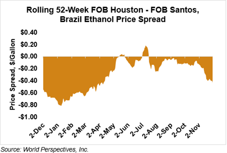 The FOB Gulf-Santos, Brazil ethanol spread has widened from last week’s close through Tuesday’s trading and is currently at -11.54 cents/liter (-43.69 cents/gallon).