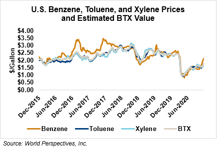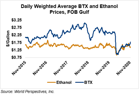 BTX component prices were sharply higher last week and are continuing that trend through Tuesday’s market close: Benzene is up 4.9 percent while Toluene is up 4.6 percent, and Xylene is up 5 percent. The estimated weighted average aromatic price is currently 46.95 cents/liter (177.72 cents/gallon), up from last Friday’s close. The BTX-Houston ethanol spread widened last week, and the weighted average BTX price is 9.69 cents/liter (36.69 cents/gallon) higher than the FOB Houston ethanol price.