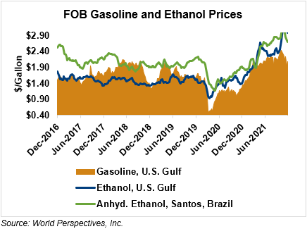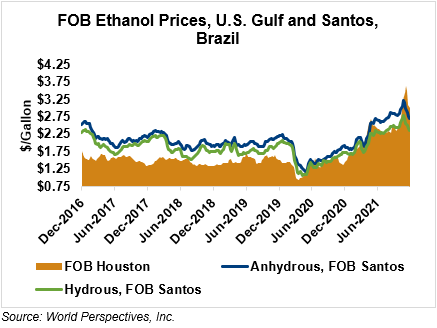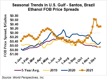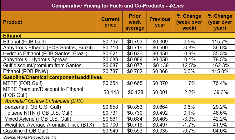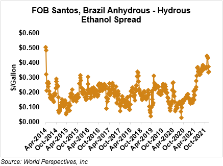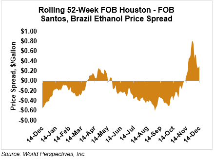 The FOB Gulf-Santos, Brazil ethanol spread has widened from last week’s close through Tuesday’s trading and is currently at 8.67 cents/liter (32.81 cents/gallon).