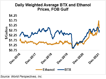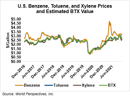 BTX component prices were higher last week but are mixed through Tuesday’s market close: Benzene is up 0.4 percent while Toluene is steady, and Xylene is down 3.2 percent. The estimated weighted average aromatic price is currently 70.57 cents/liter (267.14 cents/gallon), down from last Friday’s close. The BTX-Houston ethanol spread narrowed last week, and the weighted average BTX price is -9.11 cents/liter (-34.47 cents/gallon) lower than the FOB Houston ethanol price.