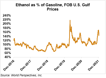 Market Outlook: U.S. ethanol prices ended last week 6 percent lower and are continued that trend in early week trading, down 2.7 percent through Tuesday’s close. Midwest wholesale rack ethanol prices were lower to end last week but are up 0.8 percent through Tuesday’s market close to their last quote of 80.77 cents/liter (305.74 cents/gallon).