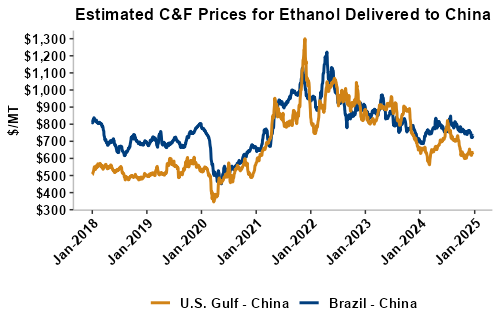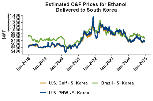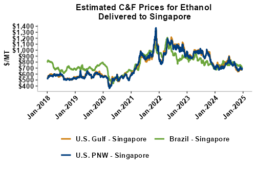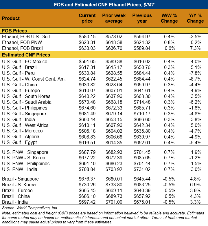 On a cost-and-freight (C&F) basis, offers are mostly higher this week as FOB ethanol offers have seen support. Prices for ethanol C&F to Central America from the U.S. Gulf are up 0.4 percent this week but are down 6.8 percent from this same week in 2023. Values for PNW ethanol to Southeast Asia average $685.37/MT this week, up 0.7 percent from the prior week but down 1.6 percent year-over-year. That compares to U.S. Gulf to Southeast Asia C&F prices that average $665.43/MT and are up 0.3 percent from last week but are down 3.3 percent year-over-year. C&F prices for Brazilian ethanol to Southeast Asia are down 0.5 percent from last week.