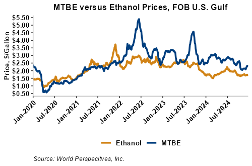 MTBE prices rose 1.6 percent last week but largely erased those gains in early week trading to fall 1.1 percent from Friday’s close through Monday’s trading. MTBE’s premium to FOB Houston ethanol has decreased from last week’s report and stands at 15.04 cents/liter (56.94 cents/gallon).