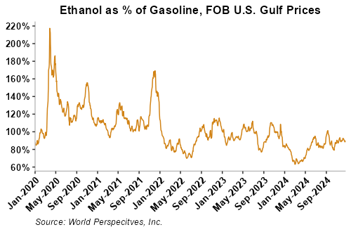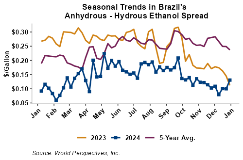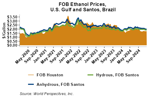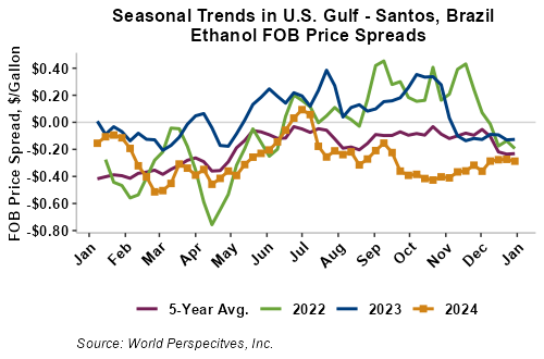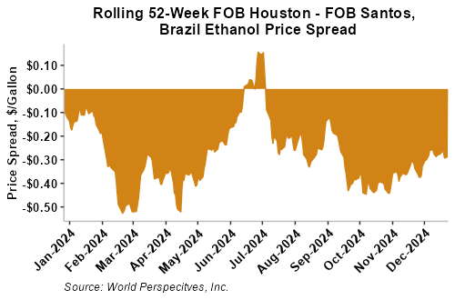 The FOB Gulf-Santos, Brazil ethanol spread has widened from last week’s close through Monday’s trading and is currently at -7.59 cents/liter (-28.72 cents/gallon).