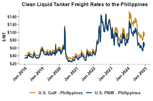 Liquid tanker rates mostly unchanged this week with freight markets entering their seasonal holiday doldrums. Tanker freight offers for the U.S. Gulf to the East Coast of Mexico have seen the largest gains so far and are up 1 percent. On average, tanker freight from the U.S. Gulf and PNW and Brazil are all unchanged in early-week, pre-holiday trade. Freight rates across all origins are 25 percent lower than this same week in 2023.