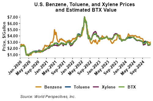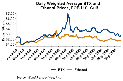 BTX component prices were sharply higher last week but showed diverging trends through Monday’s market close: Benzene was down 1.1 percent while Toluene was up 2.2 percent, and Xylene was up 1.1 percent. The estimated weighted average aromatic price is currently 73.37 cents/liter (277.72 cents/gallon), up from last Friday’s close. The BTX-Houston ethanol spread widened last week, and the weighted average BTX price is 28 cents/liter (105.99 cents/gallon) higher than the FOB Houston ethanol price.