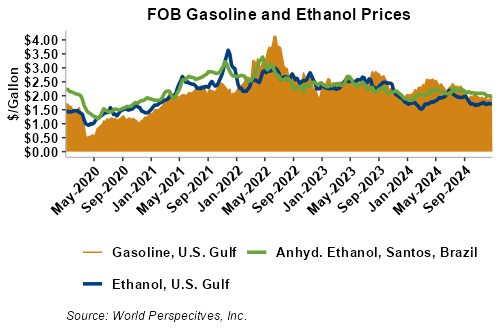 FOB Houston ethanol prices finished last week 1.8 percent lower but are up 0.8 percent through Monday’s trading from Friday’s close. FOB Houston ethanol prices are quoted at 45.36 cents/liter (171.73 cents/gallon). FOB Santos, Brazil anhydrous ethanol prices were lower last week; they are up in early week trading, rising 1 percent to 52.95 cents/liter (200.44 cents/gallon) through Monday’s close.