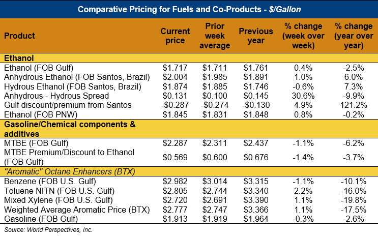 Market Outlook: U.S. ethanol prices ended last week 1.9 percent higher and were firmer still in early week trading and rose 0.6 percent through Monday’s close. Midwest wholesale rack ethanol prices were lower last week but were up 0.9 percent through Monday’s market close to their last quote of 46.59 cents/liter (176.38 cents/gallon).