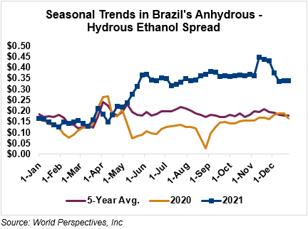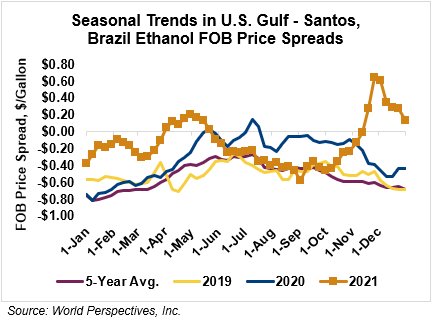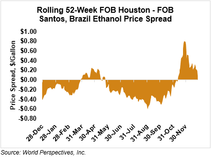 The FOB Gulf-Santos, Brazil ethanol spread has narrowed from last week’s close through Tuesday’s trading and is currently at 2.01 cents/liter (7.61 cents/gallon).