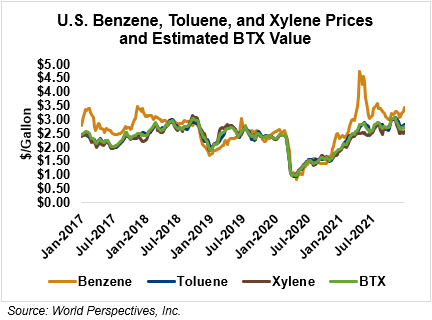 BTX component prices were mixed last week but have rallied through Tuesday’s market close: Benzene is up 4.6 percent while Toluene is up 1.6 percent, and Xylene is up 3.1 percent. The estimated weighted average aromatic price is currently 72.9 cents/liter (275.94 cents/gallon), up from last Friday’s close. The BTX-Houston ethanol spread widened last week, and the weighted average BTX price is -0.46 cents/liter (-1.72 cents/gallon) lower than the FOB Houston ethanol price.