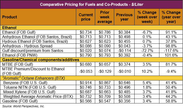 FOB Houston ethanol prices finished last week 0.6 percent higher but are down 5.4 percent through Tuesday’s trading from Friday’s close. FOB Houston ethanol prices are quoted at 73.35 cents/liter (277.66 cents/gallon). FOB Santos, Brazil anhydrous ethanol prices were lower last week; they are up in early week trading, rising 0.1 percent to 71.34 cents/liter (270.05 cents/gallon) through Tuesday’s trading.