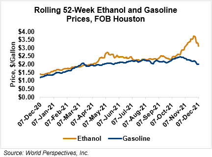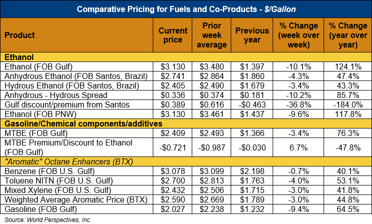 FOB Houston ethanol prices finished last week 10.3 percent lower and are down 6.6 percent through Tuesday’s trading from Friday’s close. FOB Houston ethanol prices are quoted at 82.68 cents/liter (312.98 cents/gallon). FOB Santos, Brazil anhydrous ethanol prices were lower last week; they are down in early week trading, falling 4.3 percent to 72.41 cents/liter (274.1 cents/gallon) through Tuesday’s trading.