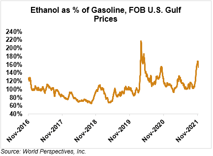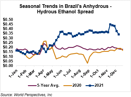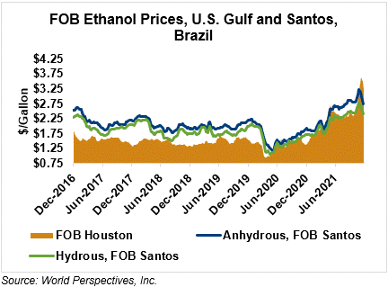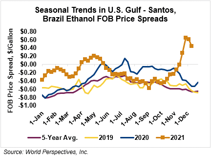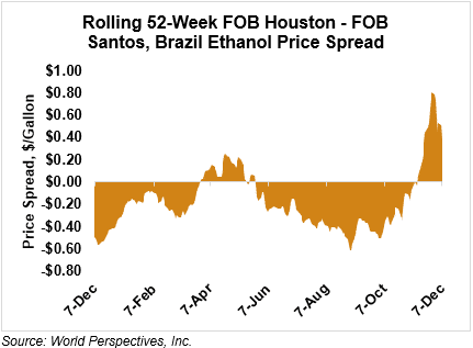 The FOB Gulf-Santos, Brazil ethanol spread has narrowed from last week’s close through Tuesday’s trading and is currently at 10.27 cents/liter (38.88 cents/gallon).