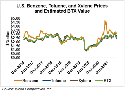 BTX component prices were sharply lower last week and are continuing that trend through Tuesday’s market close: Benzene is down 1.4 percent while Toluene is down 4 percent, and Xylene is down 3.6 percent. The estimated weighted average aromatic price is currently 68.1 cents/liter (257.77 cents/gallon), down from last Friday’s close. The BTX-Houston ethanol spread widened last week, and the weighted average BTX price is -14.58 cents/liter (-55.2 cents/gallon) lower than the FOB Houston ethanol price.