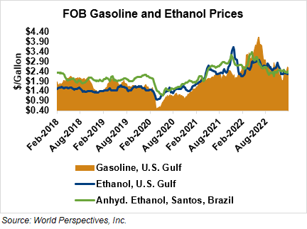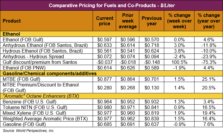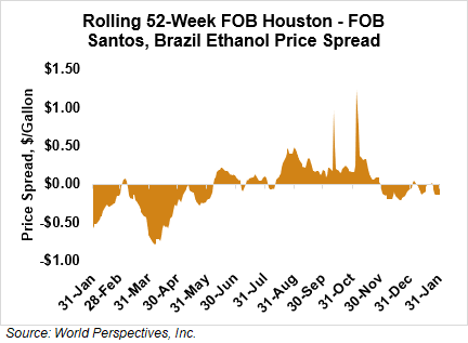 The FOB Gulf-Santos, Brazil ethanol spread has widened from last week’s close through Tuesday’s trading and is currently at -3.65 cents/liter (-13.83 cents/gallon).