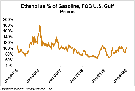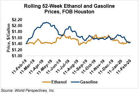 Market Outlook: U.S. ethanol prices ended last week 1.0 percent lower and are steady in early week trading. Midwest wholesale rack ethanol prices were higher to end last week and are down 0.5 percent through Tuesday’s market close to their last quote of 38.33 cents/liter (145.11 cents/gallon).