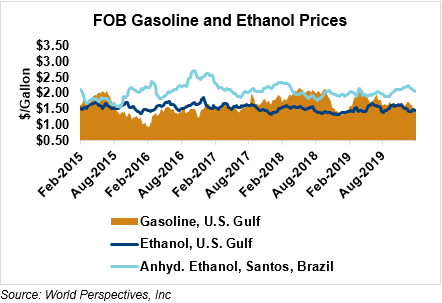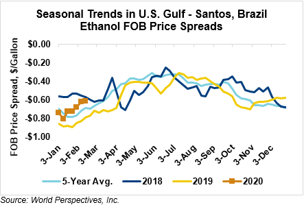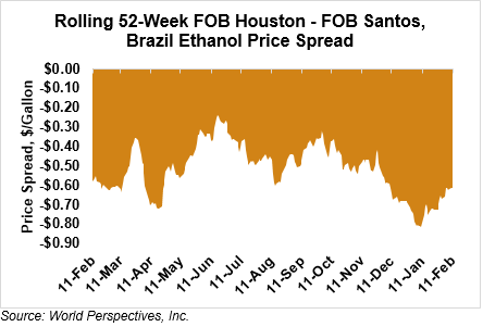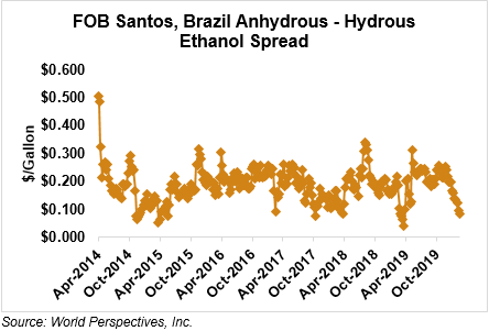 The FOB Gulf-Santos, Brazil ethanol spread has narrowed from last week’s close through Tuesday’s trading and is currently at -16.15 cents/liter (-61.14 cents/gallon).