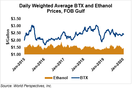 BTX component prices were mostly lower last week and have continued that trend through Tuesday’s market close: Benzene is up 0.8 percent while Toluene is down 0.4 percent, and Xylene is down 0.6 percent. The estimated weighted average aromatic price is currently 63.94 cents/liter (242.02 cents/gallon), down from last Friday’s close. The BTX-Houston ethanol spread widened last week, and the weighted average BTX price is 25.56 cents/liter (96.77 cents/gallon) higher than the FOB Houston ethanol price.
