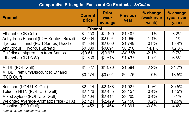 FOB Houston ethanol prices finished last week 2.0 percent higher, but prices are down 1.1 percent through Tuesday’s trading from Friday’s close. FOB Houston ethanol prices are quoted at 38.38 cents/liter (145.26 cents/gallon). FOB Santos, Brazil anhydrous ethanol prices were lower last week; they are down early this week, falling 1.4 percent to 54.53 cents/liter (206.40 cents/gallon) through Tuesday’s trading.