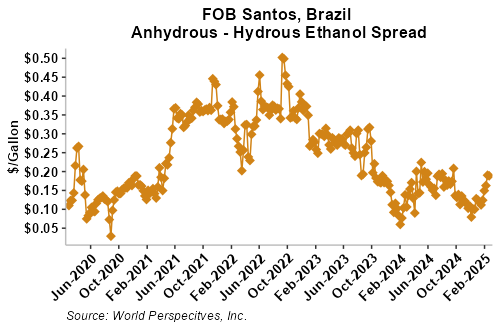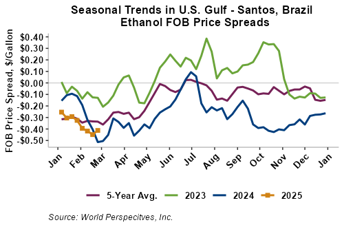 The FOB Gulf-Santos, Brazil ethanol spread has narrowed from last week’s close through Tuesday’s trading and is currently at -10.67 cents/liter (-40.38 cents/gallon).