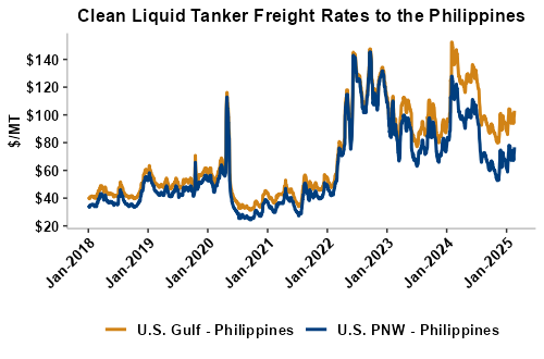 Liquid tanker rates are 7 percent higher on average this week with offers for the U.S. Gulf to South Korea seeing the largest gains (up 9 percent). Freight from the U.S. Gulf to the West Coast of Central America saw the largest declines and is down 3 percent from last week. On average, tanker freight from the U.S. Gulf is up 7 percent this week while freight from the PNW has posted a 9 percent increase. Liquid tanker freight rates from Brazil are up 6 percent, on average, this week. Freight rates across all origins are 26 percent lower than this same week in 2024.