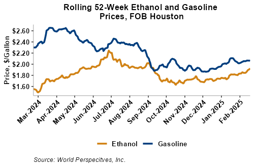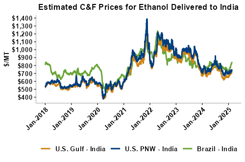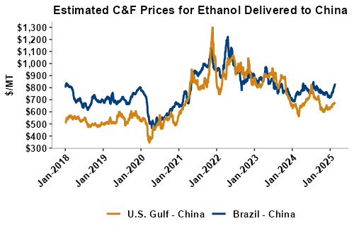 On a cost-and-freight (C&F) basis, offers are mostly higher this week as both freight rates and FOB ethanol values have climbed higher. Prices for ethanol C&F to Central America from the U.S. Gulf are up 3.3 percent this week and are up 14.2 percent from this same week in 2024. Values for PNW ethanol to Southeast Asia average $759.06/MT this week, up 3.7 percent from the prior week and up 9.8 percent year-over-year. That compares to U.S. Gulf to Southeast Asia C&F prices that average $745.29/MT and are up 3.8 percent from last week and are up 8.4 percent year-over-year. C&F prices for Brazilian ethanol to Southeast Asia are up 1.5 percent from last week.