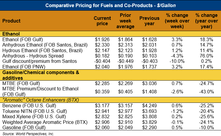 Market Outlook: U.S. ethanol prices ended last week 4 percent higher and extended those gains in early week trading and rose 1.7 percent through Tuesday’s close. Midwest wholesale rack ethanol prices were higher to end last week and were up 1.8 percent through Tuesday’s market close to their last quote of 50.63 cents/liter (191.66 cents/gallon).