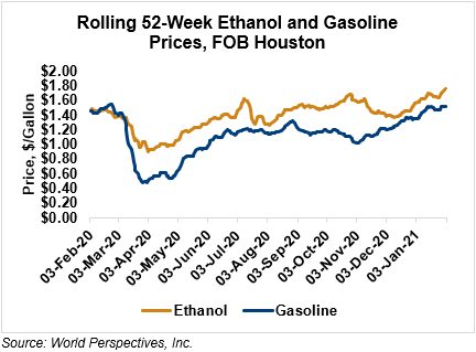 Market Outlook: U.S. ethanol prices ended last week 5.5 percent higher and are continuing that trend in early week trading, up 2.5 percent through Tuesday’s close. Midwest wholesale rack ethanol prices were higher to end last week and are up 1.9 percent through Tuesday’s market close to their last quote of 44.98 cents/liter (170.28 cents/gallon).