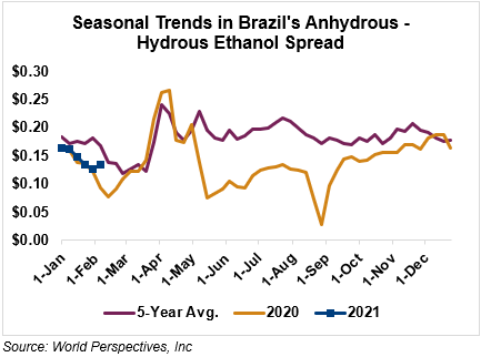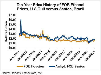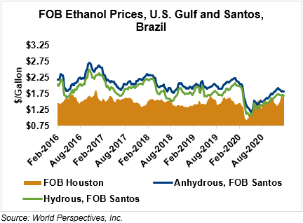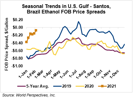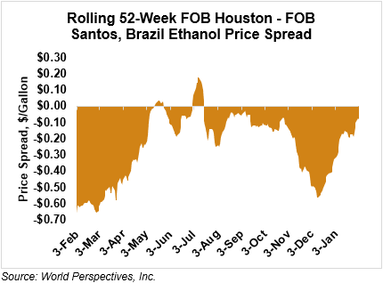 The FOB Gulf-Santos, Brazil ethanol spread has narrowed from last week’s close through Tuesday’s trading and is currently at -2.13 cents/liter (-8.07 cents/gallon).