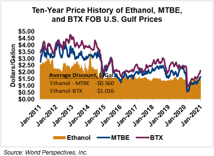 MTBE prices rose 0.9 percent last week and are extending those gains in early week trading, up 0.8 percent from Friday’s close through Tuesday’s trading. MTBE’s premium to FOB Houston ethanol has decreased from last week’s report and stands at -2.63 cents/liter (-9.95 cents/gallon).