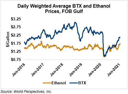 BTX component prices were mixed last week and remain so through Tuesday’s market close: Benzene is up 0.2 percent while Toluene is up 2 percent, and Xylene is down 1.3 percent. The estimated weighted average aromatic price is currently 55.69 cents/liter (210.81 cents/gallon), down from last Friday’s close. The BTX-Houston ethanol spread narrowed last week, and the weighted average BTX price is 9.32 cents/liter (35.28 cents/gallon) higher than the FOB Houston ethanol price.