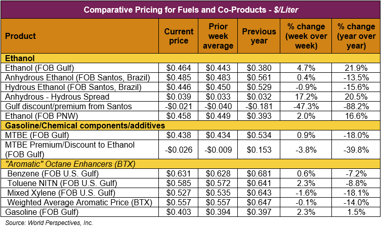 FOB Houston ethanol prices finished last week 0.7 percent higher and are up 4.7 percent through Tuesday’s trading from Friday’s close. FOB Houston ethanol prices are quoted at 46.37 cents/liter (175.53 cents/gallon). FOB Santos, Brazil anhydrous ethanol prices were lower last week; they are up in early week trading, rising 0.4 percent to 48.5 cents/liter (183.6 cents/gallon) through Tuesday’s trading.