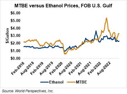 MTBE prices rose 1.2 percent last week but weakened in early week trading to fall 1.5 percent from Friday’s close through Tuesday’s trading. MTBE’s premium to FOB Houston ethanol has decreased from last week’s report and stands at 26.1 cents/liter (98.82 cents/gallon).