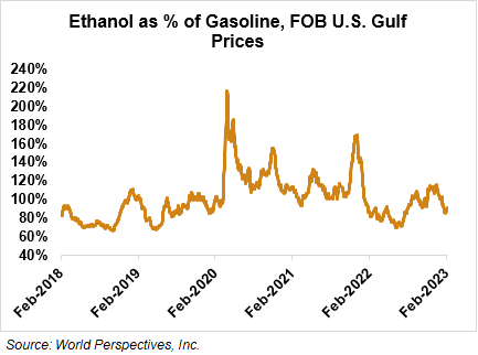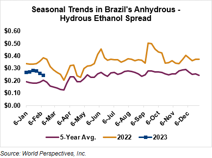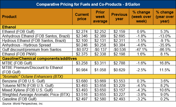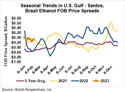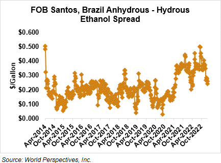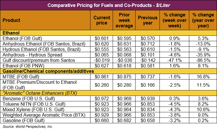 The FOB Gulf-Santos, Brazil ethanol spread has narrowed from last week’s close through Tuesday’s trading and is currently at -1.91 cents/liter (-7.23 cents/gallon).