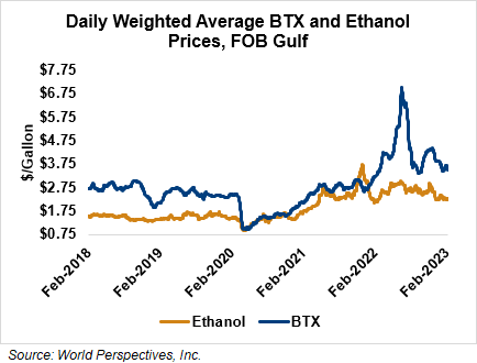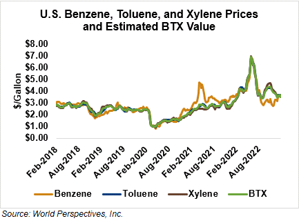BTX component prices were mixed last week and were firmer still through Tuesday’s market close: Benzene was up 0.1 percent while Toluene was down 3.9 percent, and Xylene was down 3.7 percent. The estimated weighted average aromatic price is currently 93.37 cents/liter (353.45 cents/gallon), down from last Friday’s close. The BTX-Houston ethanol spread narrowed last week, and the weighted average BTX price is 33.31 cents/liter (126.09 cents/gallon) higher than the FOB Houston ethanol price.