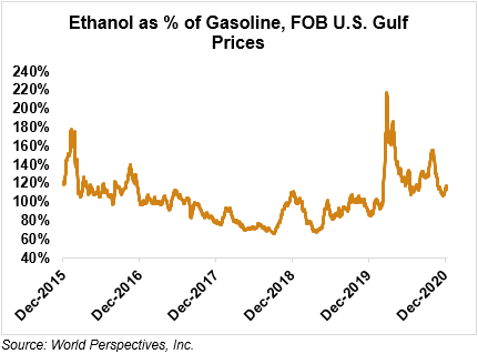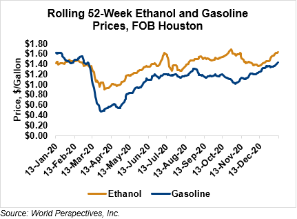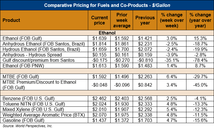 Market Outlook: U.S. ethanol prices ended last week 6.5 percent higher and are continuing that trend in early week trading, up 0.5 percent through Tuesday’s close. Midwest wholesale rack ethanol prices were higher to end last week and are up 0.5 percent through Tuesday’s market close to their last quote of 41.95 cents/liter (158.78 cents/gallon).
