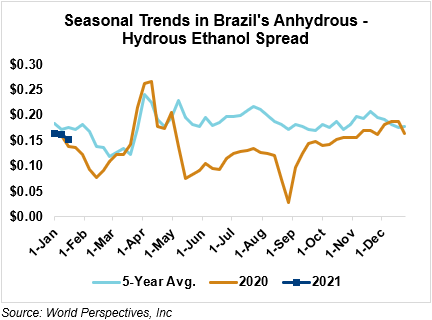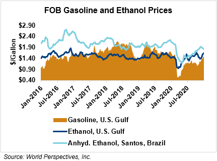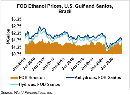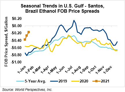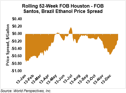 The FOB Gulf-Santos, Brazil ethanol spread has narrowed from last week’s close through Tuesday’s trading and is currently at -4.63 cents/liter (-17.52 cents/gallon).